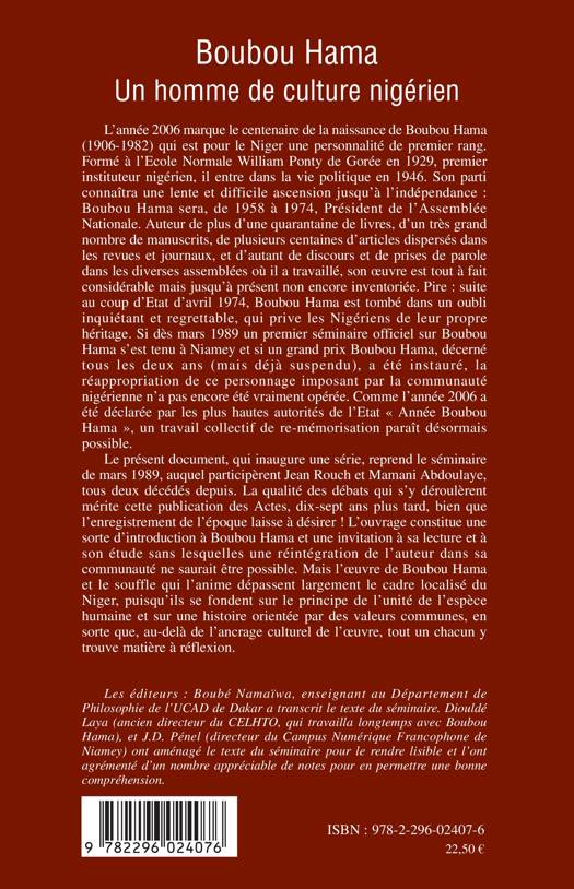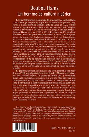 L'année 2006 marque le centenaire de la naissance de Boubou Hama (1906-1982) qui est pour le Niger une personnalité de premier rang. Premier instituteur nigérien, il entre dans le vie politique et sera Président de l'Assemblé nationale de 1958 à 1974. Auteur de nombreux livres et articles, Boubou Hama est tombé dans l'oubli suite au coup d'Etat de 1974, privant les Nigériens de leur propre héritage. Cet ouvrage reprend les débats d'un séminaire sur Boubou Hama, participant à sa réhabilitation et à sa découverte.