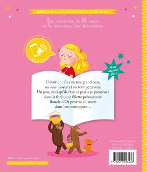 Il était une fois un très grand ours, un ours moyen et un tout petit ours. Un jour, alors qu'ils étaient partis se promener dans la forêt, une fillette prénommée Boucle d'Or pénétra en secret dans leur maisonnée... Le célèbre conte de Grimm, adapté aux petits. Avec un jeu visuel sur une double page et l'histoire à écouter.