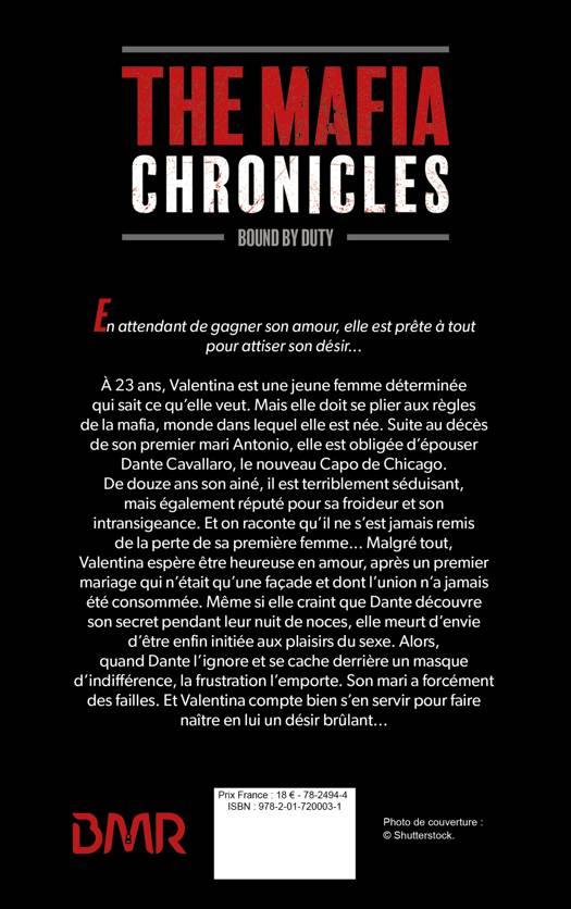 À 23 ans, Valentina est une jeune femme déterminée qui sait ce qu’elle veut. Mais elle doit se plier aux règles de la mafia, monde dans lequel elle est née. Suite au décès de son premier mari Antonio, elle est obligée d’épouser Dante Cavallaro, le nouveau Capo de Chicago. De douze ans son ainé, il est terriblement séduisant, mais également réputé pour sa froideur et son intransigeance. Et on raconte qu’il ne s’est jamais remis de la perte de sa première femme... Malgré tout, Valentina espère être heureuse en amour, après un premier mariage qui n'était qu'une façade et dont l'union n’a jamais été consommée. Même si elle craint que Dante découvre son secret pendant leur nuit de noces, elle meurt d'envie d'être enfin initiée aux plaisirs du sexe. Alors, quand Dante l’ignore et se cache derrière un masque d’indifférence, la frustration l’emporte. Son mari a forcément des failles. Et Valentina compte bien s’en servir pour faire naître en lui un désir brûlant…