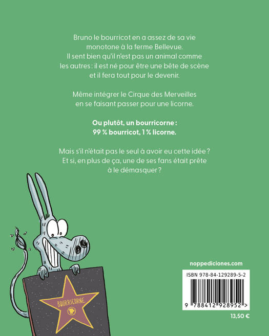 Bruno le bourricot en a assez de sa vie monotone à la ferme Bellevue. Il sent bien qu'il n'est pas un animal comme les autres : il est né pour être une bête de scène et il fera tout pour le devenir. Même intégrer le théâtre des merveilles en se faisant passer pour une licorne. Ou plutôt, un bourricorne : 99% bourricot, 1% licorne. Mais s'il n'était pas le seul à avoir eu cette idée ? Et si, en plus de ça, une de ses fans était prête à le démasquer ?