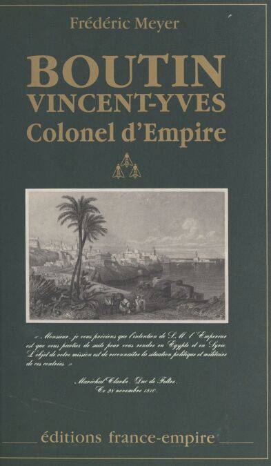 Le nom du colonel Vincent-Yves Boutin est associé à l’origine du débarquement des troupes françaises près d’Alger, en 1830, et d’une présence qui devait durer 130 ans. Cet homme, extrêmement courageux, compétent et loyal sut, dans la mission dont Napoléon l’avait chargé en 1808, comprendre le caractère profond des Algériens, pour lesquels il éprouva de l’amitié. Investi d’une autre mission, deux années plus tard, au Moyen-Orient, en Syrie et en Égypte, il y rencontra Lady Hester Stanhope, nièce de William Pitt, qui fut fort éprise de l’officier français et le prouva, par la suite, de façon spectaculaire. Ce livre a pour ambition de faire revivre le personnage méconnu et aventureux qu’était le colonel Boutin, au travers d’une reconstitution — historiquement exacte — de la vie et des mœurs quotidiennes dans ces pays au début du XIXe siècle.