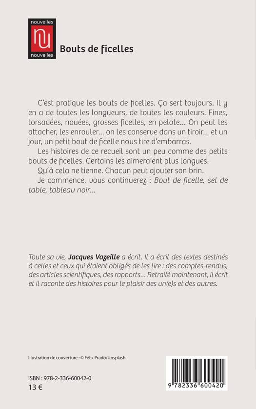 C'est pratique les bouts de ficelles. Ça sert toujours. Il y en a de toutes les longueurs, de toutes les couleurs. Fines, torsadées, nouées, grosses ficelles, en pelote... On peut les attacher, les enrouler... on les conserve dans un tiroir... et un jour, un petit bout de ficelle nous tire d'embarras. Les histoires de ce recueil sont un peu comme des petits bouts de ficelles. Certains les aimeraient plus longues. Qu'à cela ne tienne. Chacun peut ajouter son brin. Je commence, vous continuerez: Bout de ficelle, sel de table, tableau noir...