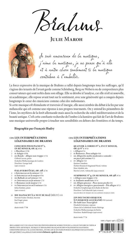 La biographie de Johannes Brahms, écrite par François Hudry, illustrée par Julie Maroh, accompagnée de 2 compacts discs. Je suis amoureux de la musique, <br /> j'aime la musique, je ne pense qu'à elle <br /> et à autre chose seulement si la musique contribue à l'embellir.<br /> Johannes Brahms<br /><br /> La force expressive de la musique de Brahms a rallié depuis longtemps tous les suffrages, qu'il s'agisse des tenants de l'avant garde comme Schönberg, Berg ou Webern ou de compositeurs plus conservateurs qui sont restés dans son sillage. Elle se dérobe à l'analyse, car elle n'est ni nouvelle, ni académique ; elle repose avant tout sur le sentiment, avec une générosité qui a conquis depuis longtemps le coeur des musiciens comme celui des mélomanes.<br /><br /> Si cette musique est stimulante et traversée d'énergie, elle aussi nimbée du début à la fin par une mélancolie qui est comme une réponse à nos propres tourments. On y entend les pénombres de l'âme, les mystères de la forêt allemande mais aussi la recherche du soleil méditerranéen et de la beauté antique. C'est cette constante recherche de l'ombre à la lumière qui fait de l'art de Brahms une musique universelle propre à toucher nos sensibilités en dehors des frontières et du temps.<br /><br /> Tracklist - Les interprétations légendaires de Brahms <br /><br /> CD 1 (77’08)<br /><br /> Concerto pour piano no 1, en ré mineur, op. 15 50'02<br /> 1 I. Maestoso 22'08<br /> 2 II. Adagio 16'00<br /> 3 III. Rondo - Allegro non troppo 11'54<br /> Clifford Curzon, piano<br /> Orchestre Philharmonique de Londres<br /> Direction : George Szell<br /> [1962 STEREO]<br /><br /> 6 Klavierstücke, op. 118 22'36<br /> 4 I Intermezzo en la mineur 1'53<br /> 5 II Intermezzo en la majeur 6'04<br /> 6 III Ballade en sol mineur 3'05<br /> 7 IV Intermezzo en fa mineur 2'33<br /> 8 V Romance en fa majeur 4'10<br /> 9 VI Intermezzo en mi b mineur 4'54<br /> Julius Katchen, piano<br /> [1962 STEREO]<br /><br /> 10 Die Mainacht (La Nuit de mai) (Hölty) 4'03<br /> Dietrich Fischer-Dieskau, baryton<br /> Karl Engel, piano<br /> [1957 MONO]<br /><br /> DUREE TOTALE CD 1 : 77 : 08<br /><br /><br /><br /> CD 2 (77'50)<br /><br /> Quatuor à cordes no 1, en ut mineur, op. 51 no 1 30'10<br /> 1 I. Allegro 8'14<br /> 2 II. Romanze. Poco adagio 6'46<br /> 3 III. Allegretto molto moderato e comodo -<br /> un poco più anima 9'13<br /> 4 IV. Allegro 5'43<br /> Quatuor Amadeus<br /> Norbert Brainin & Siegmund Nissel, violons<br /> Peter Schidlof, alto <br /> Martin Lovett, violoncelle<br /> [1959 STEREO]<br /><br /> Symphonie no 4, en mi mineur, op. 98 39'34<br /> 5 I. Allegro non troppo 12'06<br /> 6 II. Andante moderato 10’34<br /> 7 III. Allegro giocoso - Poco meno presto 6'01<br /> 8 IV. Allegro energico e passionato - Più allegro 10’13 <br /> Orchestre Symphonique de la Radio de Bavière<br /> Direction : Carl Schuricht<br /> [1962 STEREO] (Grand Prix du Disque de l'Académie Charles Cros)<br /><br /> Ein deutsches Requiem (Un Requiem allemand) 8'05<br /> (extrait)<br /> 9 Ihr habt nun Traurigkeit<br /> Elisabeth Grümmer, soprano<br /> Choeur de la Cathédrale Sainte-Hedwige<br /> Orchestre Philharmonique de Berlin<br /> Direction : Rudolf Kempe<br /> [1956 MONO]<br /><br /> Durée Totale : 77 : 34<br />
