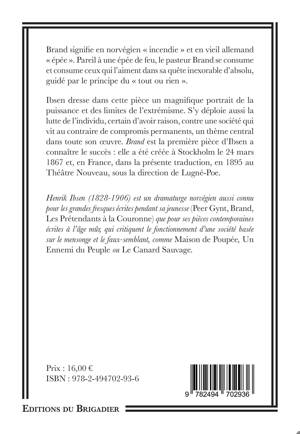 Ibsen dresse dans cette pièce un magnifique portrait de la puissance et des limites du fanatisme religieux. S’y déploie aussi la lutte de l’individu, certain d’avoir raison, contre une société qui vit au contraire de compromis permanents, un thème central dans toute son œuvre. Brand est la première pièce d’Ibsen a connaître le succès : elle a été créée à Stockholm le 24 mars 1867 et, en France, en 1895 au Théâtre Nouveau, sous la direction de Lugné-Poe.