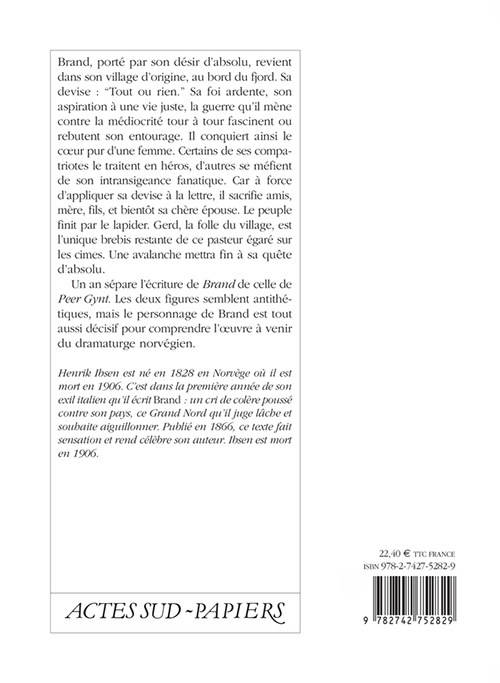 Brand, porté par son désir d'absolu, revient dans son village d'origine, au bord du fjord. Sa devise : "Tout ou rien." Sa foi ardente, son aspiration à une vie juste, la guerre qu'il mène contre la médiocrité tour à tour fascinent ou rebutent son entourage. Il conquiert ainsi le coeur pur d'une femme. Certains de ses compatriotes le traitent en héros, d'autres se méfient de son intransigeance fanatique. Car à force d'appliquer sa devise à la lettre, il sacrifie amis, mère, fils, et bientôt sa chère épouse. Le peuple finit par le lapider. Gerd, la folle du village, est l'unique brebis restante de ce pasteur égaré sur les cimes. Une avalanche mettra fin à sa quête d'absolu. Un an sépare l'écriture de Brand de celle de Peer Gynt. Les deux figures semblent antithétiques, mais le personnage de Brand est tout aussi décisif pour comprendre l'oeuvre à venir du dramaturge norvégien.