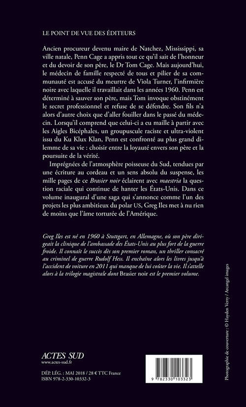 Imprégnées de l'atmosphère poisseuse du Sud, tendues par une écriture au cordeau et un sens absolu du suspense, les mille pages de ce «Brasier noir »éclairent avec «maestria »la question raciale qui continue de hanter les États-Unis. Dans ce volume inaugural d'une saga qui s'annonce comme l'un des projets les plus ambitieux du polar US, Greg Iles met à nu rien de moins que l'âme torturée de l'Amérique.