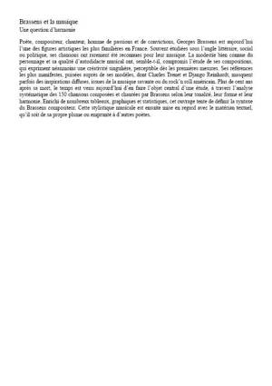 À l'occasion du centenaire de sa naissance, cet ouvrage est l'un des premiers à analyser les 150 chansons de Brassens en tant qu'œuvres avant tout musicales. Grâce à l'analyse de leur forme et de leur harmonie, ce livre, enrichi de nombreux graphiques et statistiques, apporte une contribution décisive à la connaissance de la stylistique du musicien et des rapports entre les paroles et la musique.