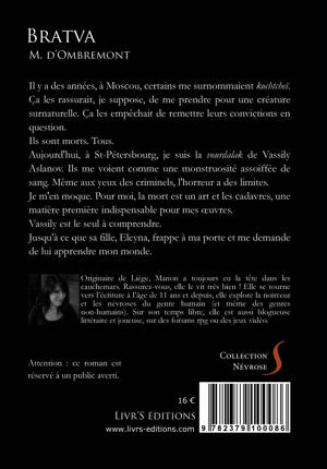 Il y a des années, à Moscou, certains me surnommaient kochtcheï. Ça les rassurait, je suppose, de me prendre pour une créature surnaturelle. Ça les empêchait de remettre leurs convictions en question. Ils sont morts. Tous. Aujourd’hui, à St-Pétersbourg, je suis la vourdalak de Vassily Aslanov. Ils me voient comme une monstruosité assoiffée de sang. Même aux yeux des criminels, l’horreur a des limites. Je m’en moque. Pour moi, la mort est un art et les cadavres, une matière première indispensable pour mes œuvres. Vassily est le seul à comprendre. Jusqu’à ce que sa fille, Eleyna, frappe à ma porte et me demande de lui apprendre mon monde.