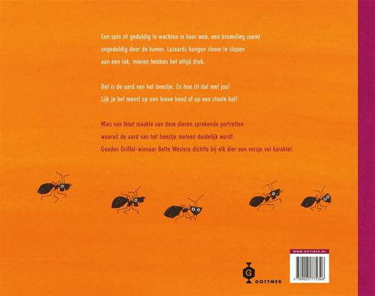 Op elke spread staan er twee dieren tegenover elkaar die soms wel op elkaar lijken, maar die juist hele verschillende karakters hebben. Een spin zit geduldig te wachten in haar web, een bromvlieg zoemt ongeduldig door de kamer. Luiaards hangen sloom te slapen aan een tak, mieren hebben het altijd druk. Dat is de aard van het beestje. En hoe zit dat met jou? Lijk jij het meest op een brave hond of op een stoute kat? Zo biedt dit boek aanknopingspunten om met kinderen interessante gesprekken te voeren, over de aard van dieren én mensen.