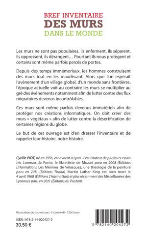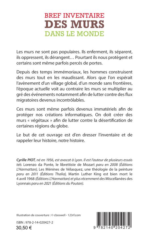 Les murs ne sont pas populaires. Ils enferment, ils séparent, ils oppressent, ils dérangent... Pourtant ils nous protègent et certains sont même parfois percés de portes. Depuis des temps immémoriaux, les hommes construisent des murs tout en les maudissant. Alors que l’on espérait l’avènement d’un village global, d’un monde sans frontières, l’époque actuelle voit au contraire les murs se multiplier au gré des événements notamment afin de lutter contre des flux migratoires devenus incontrôlables. Ces murs sont même parfois devenus immatériels afin de protéger nos créations informatiques. On doit créer des murs « végétaux » afin de lutter contre la désertification de certaines régions du globe. Le but de cet ouvrage est d’en dresser l’inventaire et de rappeler leur histoire, notre histoire.