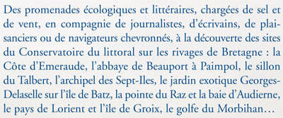Des promenades écologiques et littéraires, chargées de sel et de vent, en compagnie de journalistes, d'écrivains, de plaisanciers ou de navigateurs chevronnés, à la découverte des sites du Conservatoire du littoral sur les rivages de Bretagne : la Côte d'Emeraude, l'abbaye de Beauport à Paimpol, le sillon du Talbert, l'archipel des Sept-Iles, le jardin exotique Georges- Delaselle sur l'île de Batz, la pointe du Raz et la baie d'Audierne, le pays de Lorient et l'île de Groix, le golfe du Morbihan...