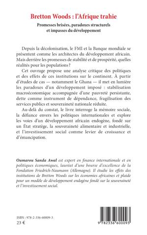 Depuis la décolonisation, le FMI et la Banque mondiale se présentent comme les architectes du développement africain. Mais derrière les promesses de stabilité et de prospérité, quelles réalités pour les populations ? Cet ouvrage propose une analyse critique des politiques et des effets de ces institutions sur le continent. À partir d'études de cas - notamment le Ghana - il met en lumière les paradoxes d'un développement imposé stabilisation macroéconomique accompagnée d'une pauvreté persistante, dette comme instrument de dépendance, fragilisation des services publics et souveraineté nationale réduite. Au-delà du constat, le livre interroge la mémoire sociale, la défiance envers les politiques internationales et explore les voies d'un développement africain endogène, fondé sur un État stratège, la souveraineté alimentaire et industrielle, et l'investissement social comme levier de croissance et d'émancipation.