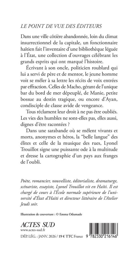 Dans une ville côtière abandonnée, loin du climat insurrectionnel de la capitale, un fonctionnaire haïtien fait l'inventaire d'une bibliothèque léguée à l'État, une collection d'ouvrages célébrant les grands esprits qui ont marqué l'histoire. Écrivant à son oncle, politicien roublard qui lui a servi de père et de mentor, le jeune homme voit se mêler à sa lettre les récits de voix entrées par effraction. Celles de Macho, gérant de l'unique bar du bord de mer dépeuplé, de Manie, petite bossue au destin tragique, ou encore d'Ayan, condisciple de classe avide de vengeance. Tous réclament leur droit à ne pas être oubliés. Les vies des humbles ne sont-elles pas, elles aussi, dignes d'être racontées ? Dans une sarabande où se mêlent vivants et morts, anonymes et héros, la "belle langue" des élites et celle de la musique des rues, Lyonel Trouillot signe une puissante ode à la multitude et dresse la cartographie d'un pays aux franges de l'oubli.
