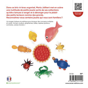 Dans ce bric-à-brac organisé, Maria Jalibert met en scène une multitude de petits jouets sortis de ses collections qu’elle s’amuse à ranger et à déranger pour le plaisir des petits lecteurs comme des grands. Reconnaitrez-vous certains jouets qui vous sont familiers ?