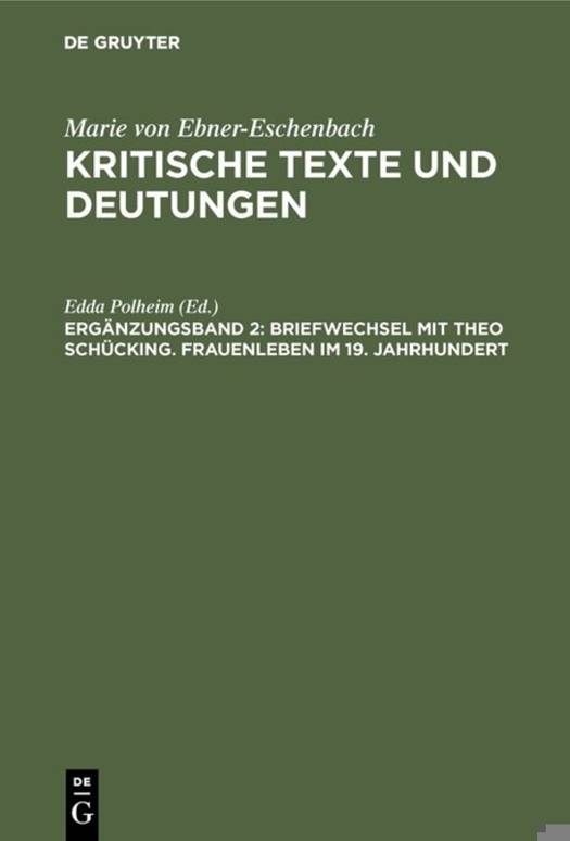 Dieser Ergänzungsband der kritischen Ebner-Eschenbach-Ausgabe stellt den Briefwechsel der Dichterin mit Theo Schücking, der Tochter des bekannten Schriftstellers Lewin Schücking, in den Mittelpunkt, geht aber beträchtlich darüber hinaus und legt weitere, wichtige Zeugnisse und Dokumente vor: Tagebücher, Novellen, Essays Theo Schückings sowie die Einleitung zu dem von ihr erstmals herausgegebenen berühmten Briefwechsel A. v. Droste - L. Schücking; ausgewählte Briefwechsel Theos Schückings mit Schriftstellerinnen wie Ida Boy-Ed, Emmy von Dincklage, Fanny Lewald, Emilie Mataja, Betty Paoli, Meta von Salis, Hermine Villinger; schließlich die Ausgabe einer Erzählung der Ebner »Die eine Sekunde«, für die Theo Schücking offenbar das Modell war. Die Kommentare und Untersuchungen befassen sich, diesem reichen Material entsprechend, mit Sein und Wirken schriftstellernder Frauen vor und um 1900, wofür Theo Schückings Schicksal geradezu als paradigmatisch gelten kann. Dessen Höhepunkt war zweifellos die Freundschaft mit Marie von Ebner-Eschenbach, der Theo Schücking in Rom zu einer wertvollen Hilfe wurde. So führen die Untersuchungen weiter zur Ebner selbst und greifen, im Zusammenhang mit den Primärquellen, nicht oder kaum behandelte Themen auf: Romerlebnis, Verhältnis zum »Salon« und zur Kritik, Beziehung zur Frauenbewegung und hier auch die Frage nach dem weiblichen oder männlichen Schreiben. Im Ganzen bietet der Band mit seiner Dokumentation wie mit den Untersuchungen vielfältige Einblicke in Frauenleben des 19. Jahrhunderts und liefert somit einen bemerkenswerten Beitrag zur Kulturwissenschaft.