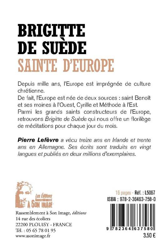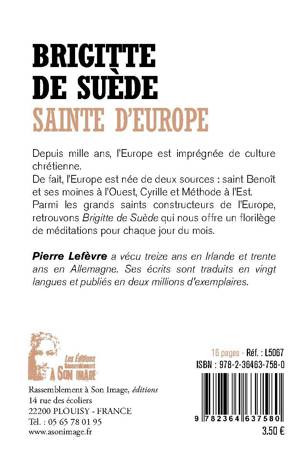 Brigitte de Suède Sainte d'Europe Depuis mille ans, l'Europe est imprégnée de culture chrétienne. De fait, l'Europe est née de deux sources : saint Benoît et ses moines à l'Ouest, Cyrille et Méthode à l'Est. Parmi les grands saints constructeurs de l'Europe, retrouvons Brigitte de Suède qui nous offre un florilège de méditations pour chaque jour du mois.