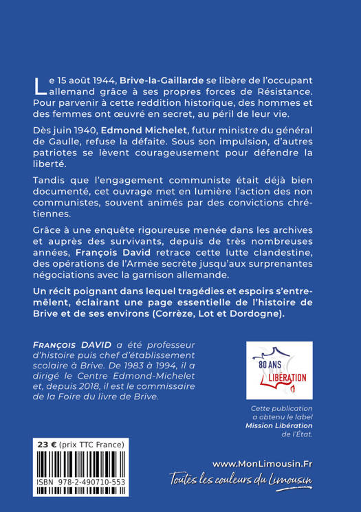 Le 15 août 1944, Brive-la-Gaillarde se libère de l’occupant allemand grâce à ses propres forces de Résistance. Pour parvenir à cette reddition historique, des hommes et des femmes ont œuvré en secret, au péril de leur vie. Dès juin 1940, Edmond Michelet, futur ministre du général de Gaulle, refuse la défaite. Sous son impulsion, d’autres patriotes se lèvent courageusement pour défendre la liberté. Tandis que l’engagement communiste était déjà bien documenté, cet ouvrage met en lumière l’action des non communistes, souvent animés par des convictions chrétiennes. Un récit poignant dans lequel tragédies et espoirs s’entremêlent, éclairant une page essentielle de l’histoire de Brive et de ses environs (Corrèze, Lot et Dordogne).