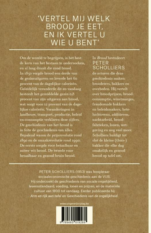 In Brood bestudeert Peter Scholliers de actoren die deze geschiedenis maken: broodeters, bakkers en overheden. Hij vertelt over broodprijzen, broodconsumptie, winstmarges, fraude, heteluchtovens, additieven, nachtarbeid, broodfabrieken, lonen, wetgeving en nog veel meer. Het huldigt de kleine (thuis)bakker die elke dag smakelijk en gezond brood op de plank zet.
