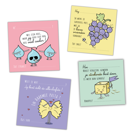 De #brooddoosbriefjes bevatten stuk voor stuk vrolijke en positieve boodschappen , die je kindje laten glimlachen .