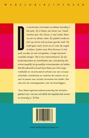 Met Broodhoofd schreef Sara Mesa, dé schrijver van haar generatie in literair Spanje, een licht ongemakkelijk en verontrustend verhaal, over een onwaarschijnlijke vriendschap, over taboes en de weerzin om je aan te passen aan sociale conventies. Een ode aan de onaangepasten, aan de dwarsliggers.