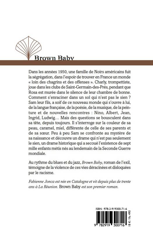 Dans les années 1950, une famille de Noirs américains fuit la ségrégation, dans l’espoir de trouver en France un monde « loin des chagrins et des offenses ». Charly, trompettiste, joue dans les clubs de Saint-Germain-des-Près, pendant que Rosa est murée dans le silence de leur chambre de bonne. Comment s’enraciner dans un sol qui n’est pas le sien ? Sam, leur fils, a soif de ce nouveau monde qui s’ouvre à lui, de la langue française, de la poésie, de la musique, de la peinture et de nouvelles rencontres : Nino, Albert, Jean, Ingrid, Ludwig… Mais des questions se bousculent dans sa tête, depuis toujours. Il s’interroge sur la couleur de sa peau, caramel, miel, différente de celle de ses parents et de sa sœur. Peu à peu Sam se confronte au mystère de sa naissance et découvre un drame qui n’est pas seulement le sien, un drame historique qui a secoué l’existence de sept mille enfants métis au lendemain de la Seconde Guerre mondiale. Au rythme du blues et du jazz, Brown Baby, roman de l’exil, témoigne de la violence de ces vies déracinées et disloquées par le racisme.