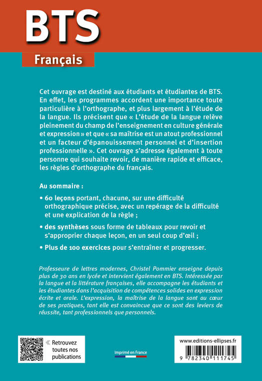 Cet ouvrage est destiné aux étudiants et étudiantes de BTS. En effet, les programmes accordent une importance toute particulière à l’orthographe, et plus largement à l’étude de la langue. Ils précisent que « L'étude de la langue relève pleinement du champ de l'enseignement en culture générale et expression » et que « sa maîtrise est un atout professionnel et un facteur d'épanouissement personnel et d'insertion professionnelle. ». Cet ouvrage s’adresse également à toute personne qui souhaite revoir, de manière rapide et efficace, les règles d’orthographe du français.