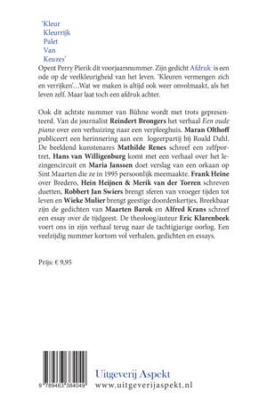 Ook dit achtste nummer van Bühne wordt met trots gepresenteerd. Van de journalist Reindert Brongers het verhaal Een oude piano over een verhuizing naar een verpleeghuis. Maran Olthoff publiceert een herinnering aan een logeerpartij bij Roald Dahl. De beeldend kunstenares Mathilde Renes schreef een zelfportret, Hans van Willigenburg komt met een verhaal over het lezingencircuit en Maria Janssen doet verslag van een orkaan op Sint Maarten die ze in 1995 persoonlijk meemaakte. Frank Heine over Bredero, Hein Heijnen & Merik van der Torren schreven duetten, Robbert Jan Swiers brengt sferen van vroeger tijden tot leven en Wieke Mulier brengt geestige doordenkertjes. Breekbaar zijn de gedichten van Maarten Barok en Alfred Krans schreef een essay over de tijdgeest. De theoloog/auteur Eric Klarenbeek voert ons in zijn verhaal terug naar de tachtigjarige oorlog. Een veelzijdig nummer kortom vol verhalen, gedichten en essays.