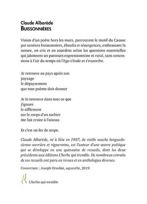 Vision d’un poète hors les murs, parcourant le motif du Causse par sentiers buissonniers, éboulis et résurgences, embrassant la nature, en cris et en sourdine selon les questions essentielles qui jalonnent un parcours expressionniste et rural, sans concessions à l’air du temps où l’égo s'étale et s'exacerbe.
