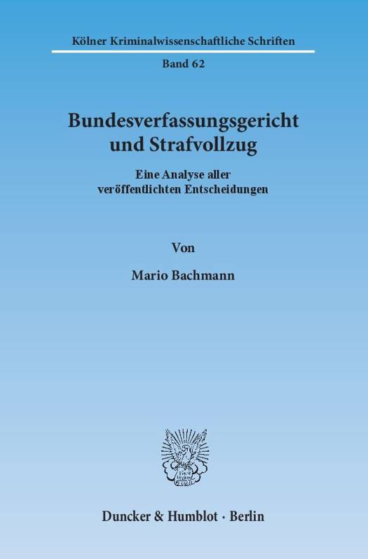 Jedes Jahr erreichen zahlreiche Verfassungsbeschwerden Strafgefangener das Bundesverfassungsgericht, dessen einschlägige Rechtsprechung weithin Anerkennung erfahren hat. Angesichts dessen ist es zentrales Anliegen dieser Arbeit, die Bedeutung des höchsten deutschen Gerichtes für den Bereich des Strafvollzuges näher zu untersuchen. Zu diesem Zweck hat Mario Bachmann erstmals alle veröffentlichten Entscheidungen des Bundesverfassungsgerichtes zum Strafvollzug analysiert und insgesamt 14 verschiedenen Themenfeldern (u.a. Vollzugslockerungen, Unterbringung, Rechts- und Datenschutz) zugeordnet. Für jeden dieser Bereiche werden zunächst die Kernaussagen der Karlsruher Richterinnen und Richter herausgearbeitet und sodann einer materiellen und prozessualen Entscheidungskritik unterzogen. Im Anschluss daran erfolgt jeweils eine Einordnung der zentralen verfassungsgerichtlichen Positionen in den zeitgeschichtlichen Kontext. Die Untersuchung ist ein Wegweiser für alle, die einen verfassungskonformen Strafvollzug zu gewährleisten haben oder aus anderen Gründen mit dieser Materie befasst sind.