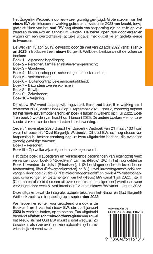 Het Burgerlijk Wetboek is opnieuw zeer grondig gewijzigd. Grote stukken van het nieuw BW zijn intussen in werking getreden of worden in 2023 van kracht, terwijl grote stukken van het oud BW nog steeds van toepassing zijn en zelfs op vele plaatsen vernieuwd en aangevuld werden. De beide lopen dus door elkaar en vragen om een overzichtelijke, actuele uitgave, met duidelijke en gedetailleerde trefwoorden.