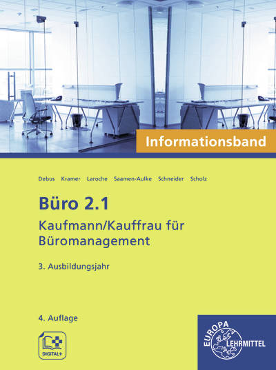 Lehr- und Lernbuch für den Ausbildungsberuf Kaufmann/Kauffrau für Büromanagement. Der Informationsband ist Bestandteil des umfassenden Europa-Programms Büro 2.1. Büro 2.1 folgt dem kompetenzorientierten Rahmenlehrplan nach dem Lernfeldkonzept. Die Unterrichtswerke des Programms sind aufeinander abgestimmt. Sie sind gezielt an einer Didaktik ausgerichtet, die Handlungsorientierung betont und Lernende zu selbstständigem Planen, Durchführen, Kontrollieren und Beur-teilen von Arbeitsaufgaben unter Berücksichtigung aller Kompetenzdimensionen führt. Dabei wird die berufliche Wirklichkeit als Ganzes mit ihren ökonomischen, ökologischen, rechtlichen und sozialen Aspekten erfasst. Das Konzept von Büro 2.1, das handlungs- und fachsystematische Strukturen miteinander verschränkt, deckt alle Anforderungen des Ausbildungsberufes von der fachlichen Aufgabenerfüllung bis hin zu einem reflektierten Verständnis von Handeln in beruflichen Zusammenhängen ab. Die Informationen sind schülergerecht, übersichtlich und verständlich aufbereitet und werden anschaulich in zahlreichen Beispielen, Tabellen, Struktogrammen und kurzen, präzisen Zusammenfassungen präsentiert. Aufgabenblöcke nach jedem Teilkapitel ergänzen die informativen Darstellungen. Die systematisierenden Sachdarstellungen stellen zudem die zur Bewältigung der Lernsituationen von Büro 2.1 notwendigen Wissensbestände vollständig bereit; sie greifen aber auch verallgemeinernd über die Situationsbezüge hinaus, z. B. durch zahlreiche Hinweise auf Gesetzestexte.