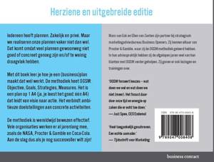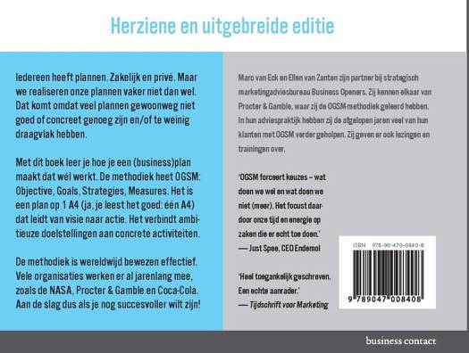 Iedereen heeft plannen. Zakelijk en privé. Maar we realiseren onze plannen vaker niet dan wel. Dat komt omdat veel plannen gewoonweg niet goed of concreet genoeg zijn en/of te weinig draagvlak hebben. Met dit boek leer je hoe je een (business)plan maakt dat wél werkt. De methodiek heet OGSM: Objective, Goals, Strategies, Measures. Het is een plan op 1 A4 (ja, je leest het goed: één A 4) dat leidt van visie naar actie. Het verbindt ambitieuze doelstellingen aan concrete activiteiten. De methodiek is wereldwijd bewezen effectief. Vele organisaties werken er al jarenlang mee, zoals de NASA, Procter & Gamble en Coca-Cola. Aan de slag dus als je nog succesvoller wilt zijn!