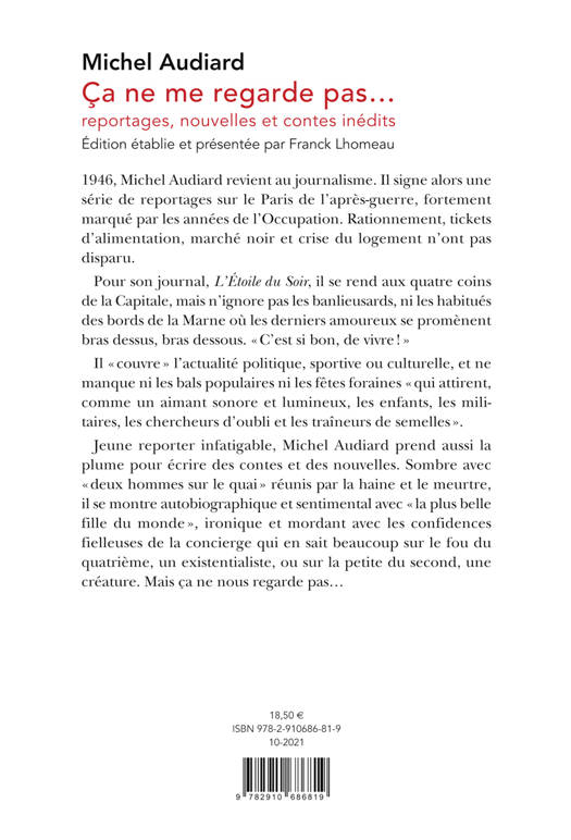 1946, Michel Audiard revient au journalisme. Il signe alors une série de reportages sur le Paris de l'après-guerre, fortement marqué par les années de l'Occupation : tickets d'alimentation, marché noir et crise du logement n'ont pas disparu. Pour L' Étoile du Soir, il se rend aux quatre coins de la Capitale, mais n'ignore pas les banlieusards ou les habitués des bords de la Marne. Il « couvre » l'actualité politique, sportive ou culturelle, et ne manque ni les bals populaires ni les fêtes foraines. Jeune reporter infatigable, Michel Audiard prend aussi la plume pour écrire des contes et des nouvelles. Sombre avec « Deux hommes sur le quai », il se montre autobiographique et sentimental avec « La plus belle fille du monde », ironique et mordant avec les confidences fielleuses de la concierge qui en sait beaucoup sur le fou du quatrième, un existentialiste, ou sur la petite du second, une créature.