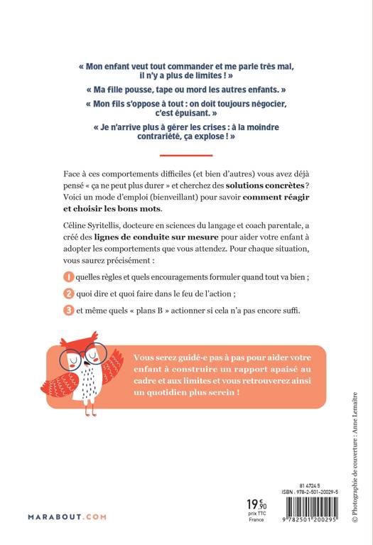 Céline Syritellis, docteure en sciences du langage et coach parentale, a créé des lignes de conduite sur mesure pour aider votre enfant à adopter les comportements que vous attendez. Pour chaque situation, vous saurez précisément :