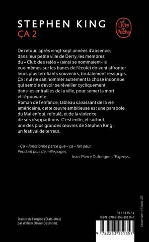 De retour, après vingt-sept années, dans leur petite ville de Derry, les membres du « Club des ratés » (ainsi se nommaient-ils eux-mèmes sur les bancs de l'école) doivent affronter leurs plus terrifiants souvenirs, brutalement ressurgis. ça: nul ne sait nommer autrement la chose inconnue qui semble devoir se réveiller cycliquement dans les entrailles de la ville, pour semer la mort et l'épouvante. Roman de l'enfance, tableau saisissant de la vie américaine, cette oeuvre ambitieuse est une parabole du Mal enfoui, refoulé, et de la violence de ses réapparitions. C'est enfin, et surtout, une des plus grandes oeuvres de Stephen King, un festival de terreur.