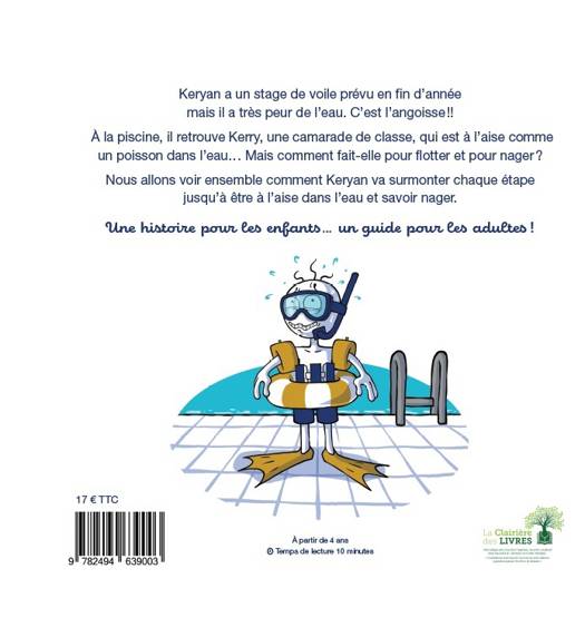 Keryan a un stage de voile prévu en fin d’année mais il a très peur de l’eau. C’est l’angoisse !! À la piscine, il retrouve Kerry, une camarade de classe, qui est à l’aise comme un poisson dans l’eau… Mais comment fait-elle pour flotter et pour nager ? Nous allons voir ensemble comment Keryan va surmonter chaque étape jusqu’à être à l’aise dans l’eau et savoir nager. Une histoire pour les enfants… un guide pour les adultes !