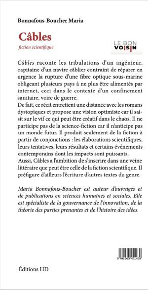 Ce texte intitulé Câbles est une fiction scientifique. Il est volontairement court comme pouvaient l’être certains contes philosophiques, descriptions d’un monde chaotique écrits sur un ton ironique et joyeux. De fait, ce récit entretient une distance avec les romans dystopiques. Il propose une vision optimiste car il saisit sur le vif ce qui peut être créatif dans le chaos. Il ne participe pas de la science fiction car il n’anticipe pas un monde futur. Il produit seulement de la fiction à partir de conjonctions : les élaborations scientifiques, leurs tentatives, leurs résultats et certains événements contemporains dont les impacts sont puissants. Aussi, Câbles a l’ambition de s’inscrire dans une veine littéraire que peut être celle de la fiction scientifique. Il préfigure d’ailleurs l’écriture d’autres textes du genre. Câbles raconte les tribulations d’un ingénieur, capitaine d’un navire câblier contraint de réparer en urgence la rupture d’une fibre optique sous-marine obligeant plusieurs pays à ne plus être alimentés par internet, ceci dans le contexte d’un confinement sanitaire, voire de guerre.