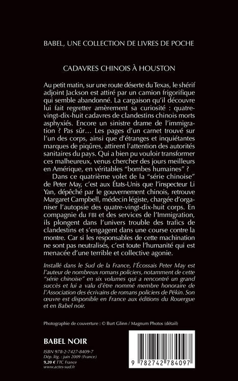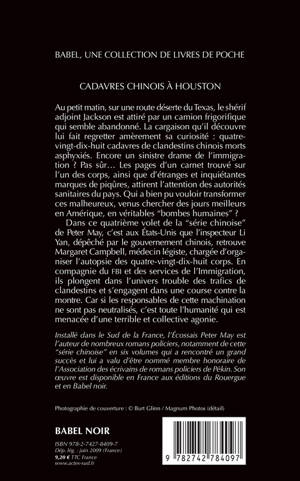 Au petit matin, sur une route déserte du Texas, le shérif adjoint Jackson est attiré par un camion frigorifi que qui semble abandonné. La cargaison qu'il découvre lui fait regretter amèrement sa curiosité : quatre vingt-dix-huit cadavres de clandestins chinois morts asphyxiés. Encore un sinistre drame de l'immigration ? Pas sûr... Les pages d'un carnet trouvé sur l'un des corps, ainsi que d'étranges et inquiétantes marques de piqûres, attirent l'attention des autorités sanitaires du pays. Qui a bien pu vouloir transformer ces malheureux, venus chercher des jours meilleurs en Amérique, en véritables "bombes humaines" ? Dans ce quatrième volet de la "série chinoise" de Peter May, c'est aux Etats-Unis que l'inspecteur Li Yan, dépêché par le gouvernement chinois, re trouve Elizabeth Campbell, médecin légiste, chargée d'organiser l'autopsie des quatre-vingt-dix-huit corps. En compagnie du FBI et des services de l'Immigration, ils plongent dans l'univers trouble des trafics declandestins et s'engagent dans une course contre la montre. Car si les responsables de cette machination ne sont pas neutralisés, c'est toute l'humanité qui est menacée d'une terrible et collective agonie.