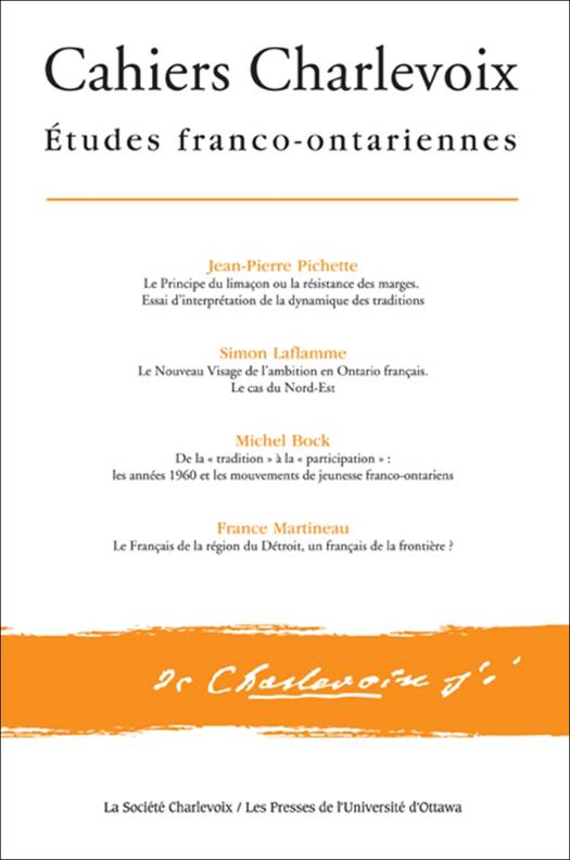 Ce huitième volume des Cahiers Charlevoix - la publication bisannuelle de la Société Charlevoix - regroupe quatre études sur l'Ontario français : Jean-Pierre Pichette (Université Sainte-Anne), examine la sanction de l'aîné célibataire, une pratique qui a profondément marqué le rituel du mariage franco-ontarien; Simon Laflamme (Université Laurentienne) présente le nouveau visage de l'ambition de la jeunesse franco-ontarienne; Michel Bock (Université d'Ottawa) regarde des mouvements de jeunesse franco-ontariens du milieu du XXe siècle et la contribution de France Martineau (Université d'Ottawa) porte sur le français de la région du Détroit. Publié en français