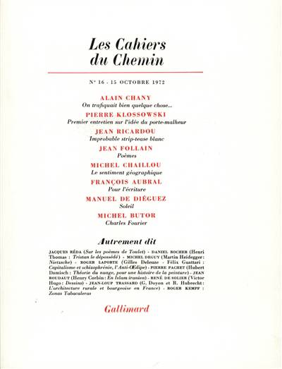 Alain Chany, On trafiquait bien quelque chose... Pierre Klossowski, Premier entretien sur l'idée du porte-malheur Jean Ricardou, Improbable strip-tease blanc Jean Follain, Poèmes Michel Chaillou, Le sentiment géographique Francois Aubral, Notes pour l'écriture Manuel de Diéguez, Soleil Michel Butor, Charles Fourier Jacques Réda, Sur les poèmes de Toulet Daniel Rocher, Henri Thomas, Tristan le dépossédé Michel Deguy, Martin Heidegger, Nietzsche Roger Laporte, Gilles Deleuze, Félix Guattari, Capitalisme et schizophrénie, l'anti-Œdipe Pierre Pachet, Hubert Damisch, Théorie du nuage, pour une histoire de la peinture Jean Roudaut, Henry Corbin, En Islam iranien René de Solier, Victor Hugo, Dessins Jean-Loup Trassard, G. Doyon et R. Hubrecht, L'architecture rurale et bourgeoise en France Roger Kempf, Zonas Tabacaleras