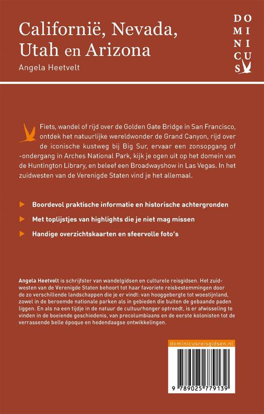 Ontdek het zuidwesten van de Verenigde Staten op vakantie met deze Dominicus-reisgids en verken de prachtige staten Californië, Arizona, Utah en Nevada. Nieuwsgierig naar cultuurbepalende wereldsteden als San Francisco en Los Angeles? Op zoek naar ongerepte en indrukwekkende natuurmonumenten? De zuidwestelijke hoek van de Verenigde Staten is voor iedereen een gebied vol hoogtepunten. Ga op verkenning in de Grand Canyon, bezoek de nationale parken van Utah of rijd over de iconische kustweg bij Big Sur. Of bezoek het bruisende Las Vegas of Los Angeles en kijk je ogen uit op het domein van de Huntington Library. Deze reisgids staat boordevol praktische informatie, historische achtergronden, handige overzichtskaarten, sfeervolle foto's en uitgebreide culturele achtergrondinformatie, is altijd up-to-date en geschreven door een Nederlandstalige expert.