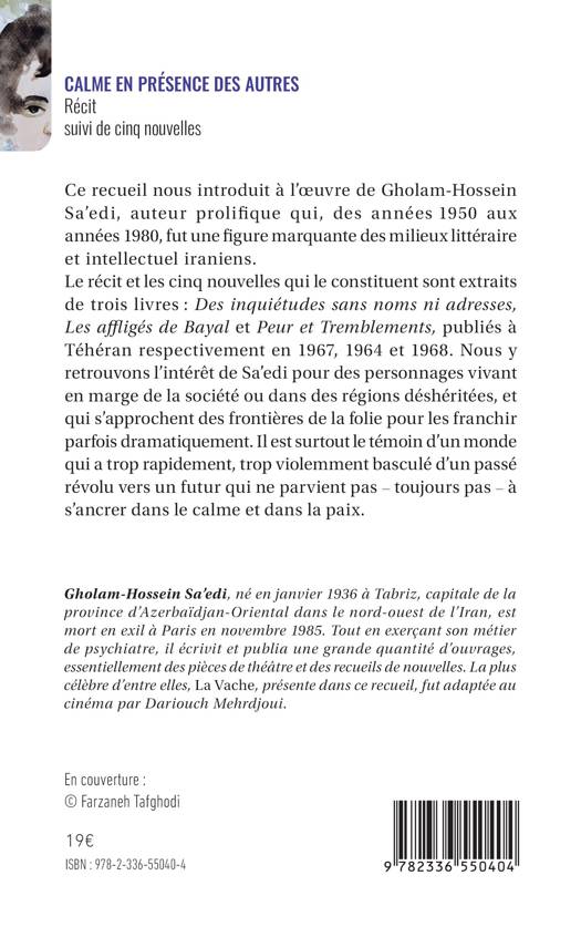 Ce recueil nous introduit à l'oeuvre de Gholam-Hossein Sa'edi, auteur prolifique qui, des années 1950 aux années 1980, fut une figure marquante des milieux littéraire et intellectuel iraniens. Le récit et les cinq nouvelles qui le constituent sont extraits de trois livres: Des inquiétudes sans noms ni adresses, Les affligés de Bayal et Peur et Tremblements, publiés à Téhéran respectivement en 1967, 1964 et 1968. Nous y retrouvons l'intérêt de Sa'edi pour des personnages vivant en marge de la société ou dans des régions déshéritées, et qui s'approchent des frontières de la folie pour les franchir parfois dramatiquement. Il est surtout le témoin d'un monde qui a trop rapidement, trop violemment basculé d'un passé révolu vers un futur qui ne parvient pas - toujours pas - à s'ancrer dans le calme et dans la paix.