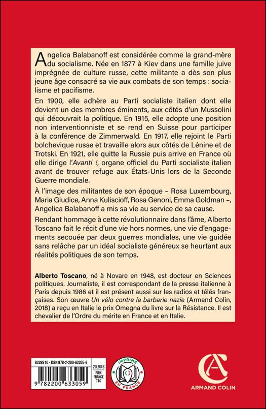 Née en 1877 à Kiev dans une famille juive imprégnée de culture russe, Angelica Balabanoff a tour à tour vécu en Belgique, Italie, Russie, France, Etats Unis avant de revenir s'installer en Italie pour y vivre le reste de son âge. A chaque étape de sa vie, elle a oeuvré aux côtés de personnalités telles que Mussolini, Lénine, Trotski ou encore Ben Gourion.