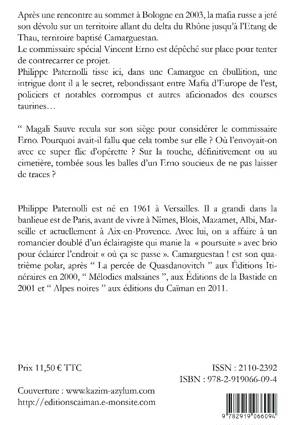 Après une rencontre au sommet à Bologne en 2003, la mafia russe a jeté son dévolu sur un territoire allant du delta du Rhône jusqu'à l'Etang de Thau, territoire baptisé Camarguestan. Le commissaire spécial Vincent Erno est dépêché sur place pour tenter de contrecarrer ce projet. Philippe Paternolli tisse ici, dans une Camargue en ébullition, une intrigue dont il a le secret, rebondissant entre Mafia d'Europe de l'est, policiers et notables corrompus et autres aficionados des courses taurines...