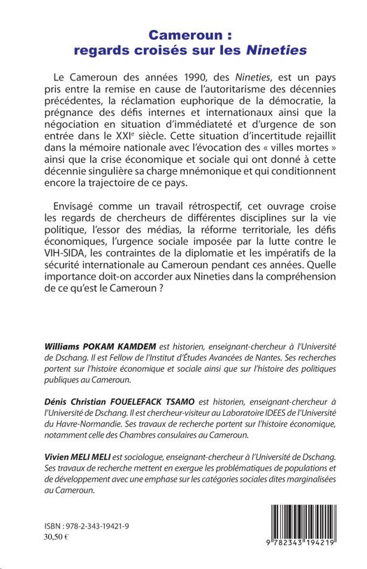 Le Cameroun des années 1990, des Nineties, est un pays pris entre la remise en cause de l'autoritarisme des décennies précédentes, la réclamation euphorique de la démocratie, la prégnance des défis internes et internationaux ainsi que la négociation en situation d'immédiateté et d'urgence de son entrée dans le XXIe siècle. Envisagé comme un travail rétrospectif, cet ouvrage croise les regards de chercheurs de différentes disciplines. Quelle importance doit-on accorder aux Nineties dans la compréhension de ce qu'est le Cameroun ?