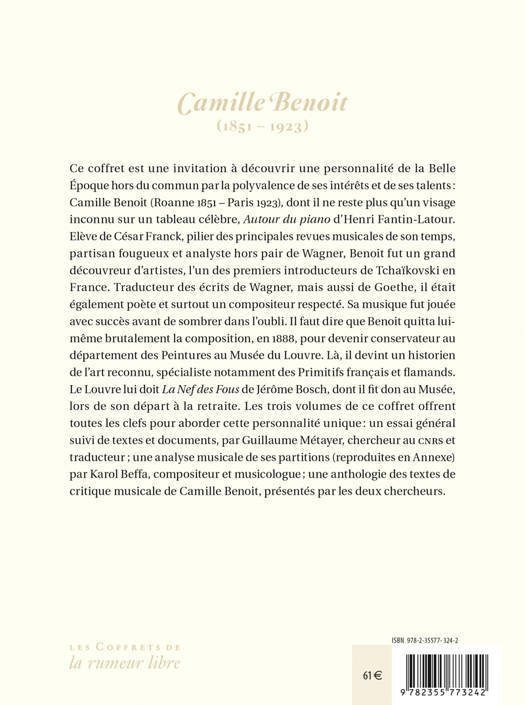 Les trois volumes de ce coffret offrent toutes les clefs pour aborder la personnalité hors du commun de Camille Benoit (Roanne 1851 – Paris 1923) QUOI ? Ce coffret est une invitation à découvrir une personnalité de la Belle Époque hors du commun par la polyvalence de ses intérêts et de ses talents : Camille Benoit (Roanne 1851 – Paris 1923), dont il ne reste plus qu’un visage inconnu sur un tableau célèbre, Autour du piano d’Henri Fantin-Latour. Elève de César Franck, pilier des principales revues musicales de son temps, partisan fougueux et analyste hors pair de Wagner, Benoit fut un grand découvreur d’artistes, l’un des premiers introducteurs de Tchaïkovski en France. Traducteur des écrits de Wagner, mais aussi de Goethe, il était également poète et surtout un compositeur respecté. Sa musique fut jouée avec succès avant de sombrer dans l’oubli. Il faut dire que Benoit quitta lui-même brutalement la composition, en 1888, pour devenir conservateur au département des Peintures au Musée du Louvre. Là, il devint un historien de l’art reconnu, spécialiste notamment des Primitifs français et flamands. Le Louvre lui doit La Nef des Fous de Jérôme Bosch, dont il fit don au Musée, lors de son départ à la retraite. Les trois volumes de ce coffret offrent toutes les clefs pour aborder cette personnalité unique : un essai général suivi de textes et documents, par Guillaume Métayer, chercheur au cnrs et traducteur ; une analyse musicale de ses partitions (reproduites en Annexe) par Karol Beffa, compositeur et musicologue ; une anthologie des textes de critique musicale de Camille Benoit, présentés par les deux chercheurs. COMMENT ? 3 volumes réunis dans un coffret ⢠Volume 1 Camille Benoit critique musical. Textes choisis, présentés et annotés par Karol Beffa et Guillaume Métayer Le Volume 1 (352 pages) est une invitation à découvrir Camille Benoit (Roanne 1851 – Paris 1923). Élève de César Franck, militant pionnier de la musique wagnérienne, Benoit, pilier des principales revues musicales de son temps, analyste hors pair de Wagner, capable de croiser la philosophie de Darwin et la musicologie, fut un grand découvreur d’artistes, l’un des premiers introducteurs de Tchaïkovski en France. Traducteur des écrits du Maître de Bayreuth, mais aussi de Goethe, il était également poète, et surtout un compositeur respecté. Ses morceaux furent joués avec succès avant de sombrer totalement dans l’oubli. Il faut dire que Benoit quitta lui-même brutalement la musique, en 1888, pour devenir conservateur au département des Peintures au Musée du Louvre. Là, il devint un historien de l’art reconnu, spécialiste notamment des Primitifs français et flamands. Le Louvre lui doit La Nef des Fous de Jérôme Bosch, dont il fit don au Musée, lors de son départ à la retraite. ⢠Volume 2 À la recherche d’un polymathe oublié, Camille Benoit (1851-1923) par Guillaume Métayer Le Volume 2 (160 pages) est un essai sur Camille Benoit (Roanne 1851 – Paris 1923) qui invite à découvrir cette personnalité originale d’un polymathe capable de passer avec brio de la composition et de la critique musicales à la poésie, à la traduction et finalement à l’histoire de l’art, sans parvenir vraiment à imposer son nom dans l’histoire. Cette étude vise à faire le portrait de ce brillant inconnu, à s’interroger sur les raisons de sa disparition et, à travers elle, à questionner le fonctionnement disciplinaire de la mémoire historique. ⢠Volume 3 Camille Benoit compositeur par Karol Beffa Le Volume 3 (128 pages) analyse et commente plusieurs oeuvres musicales de Camille Benoit (Roanne 1851 – Paris 1923). Tombé aujourd’hui dans l’oubli, cet élève de César Franck fut un critique musical très en vogue et un compositeur fort apprécié de ses contemporains. Remarquablement ouvert à la diversité des tendances musicales de son temps, Camille Benoit a subi dans sa musique les influences conjuguées de Wagner et de Franck, quoique Fauré ne le laissât pas indifférent. Parmi les oeuvres retrouvées ici par Guillaume Métayer figure un manuscrit qu’il a découvert dans un fonds de la BnF et jusqu’alors attribué au compositeur Raymond Bonheur ; l’analyse de Karol Beffa permet de le restituer à son véritable auteur. QUI ? LES AUTEURS Guillaume Métayer, directeur de recherche au cnrs (cellf- Sorbonne Université), est spécialiste de la littérature et de la philosophie de la Belle Époque (Nietzsche, Anatole France) mais aussi poète et traducteur de l’allemand et du hongrois. Il dirige la collection Centrale / Poésie chez Rumeurs éditions. Karol Beffa, compositeur et pianiste, est maître de conférences à l’École normale supérieure. Son catalogue est riche de plus de cent cinquante opus. Musicologue, il est l’auteur de plusieurs ouvrages, dont György Ligeti (Fayard), L’Autre XXème Siècle musical (Buchet-Chastel) et Bernard Herrmann (Actes Sud).