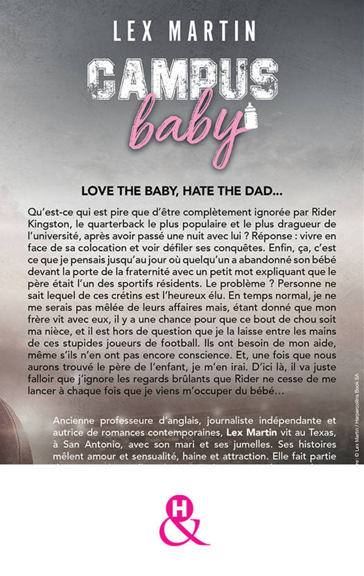 A propos de l'autrice Ancienne professeure d’anglais, journaliste indépendante et autrice de romances contemporaines, Lex Martin vit au Texas, à San Antonio, avec son mari et ses jumelles. Ses histoires mêlent amour et sensualité, haine et attraction. Elle fait partie des auteurs best-sellers du USA Today grâce à plusieurs de ses romans, dont The Varsity Dad Dilemma (Campus Baby).