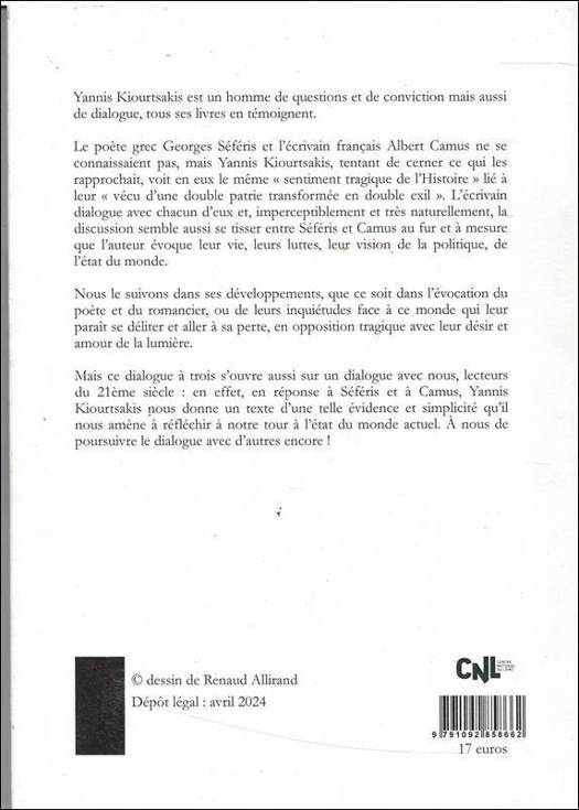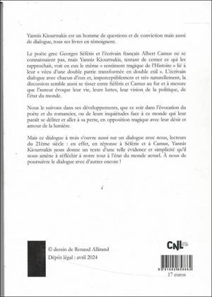 Mais ce dialogue à trois s'ouvre aussi sur un dialogue avec nous, lecteurs du 21ème siècle : en effet, en réponse à Séféris et à Camus, Yannis Kiourtsakis nous donne un texte d'une telle évidence et simplicité qu'il nous amène à réfléchir à notre tour à l'état du monde actuel. À nous de poursuivre le dialogue avec d'autres encore !