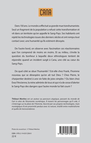 Dans 150 ans. Le monde a effectué sa grande mue transhumaniste. Seul un fragment de la population a refusé cette transformation et vit dans un territoire qu'on appelle le Sang-Pays. Ses habitants ont rejeté les technologies issues des derniers siècles et ont rompu tout contact avec une humanité qu'ils estiment dévoyée. De l'autre bord, on observe avec fascination ces réactionnaires que l'on comprend de moins en moins. Et au milieu, s'invite la question du bonheur à laquelle deux ethnologues tentent de répondre quand un incident surgit à Cana, une cité au coeur du Sang-Pays. De quel côté se situe l'humanité ? Est-elle chez Frank, l'homme nouveau qui se désespère qu'on ait tué Dieu ? Chez Pierre, le charpentier destiné à une vie faite de joies simples ? Ou bien chez Ewa l'Ancienne, la reine admirée de tous et qui n'a de cesse d'alerter le Sang-Pays des dangers que l'autre monde lui fait courir ?