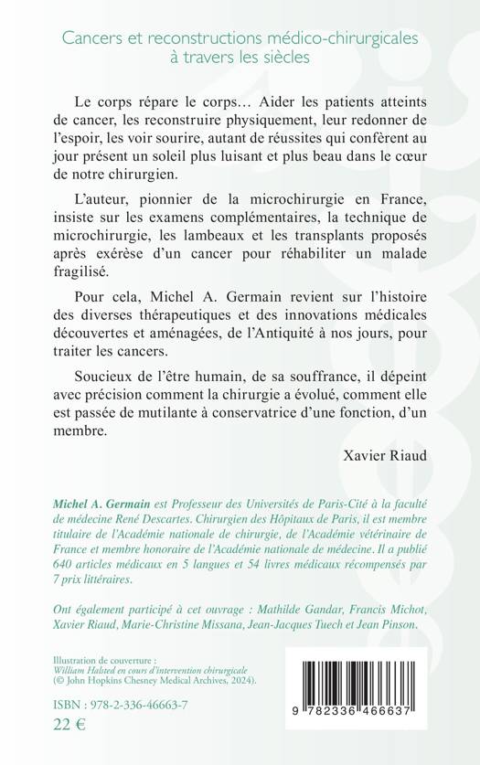 Le corps répare le corps… Aider les patients atteints de cancer, les reconstruire physiquement, leur redonner de l’espoir, les voir sourire, autant de réussites qui confèrent au jour présent un soleil plus luisant et plus beau dans le cœur de notre chirurgien. L’auteur, pionnier de la microchirurgie en France, insiste sur les examens complémentaires, la technique de microchirurgie, les lambeaux et les transplants proposés après exérèse d’un cancer pour réhabiliter un malade fragilisé. Pour cela, Michel A. Germain revient sur l’histoire des diverses thérapeutiques et des innovations médicales découvertes et aménagées, de l’Antiquité à nos jours, pour traiter les cancers. Soucieux de l’être humain, de sa souffrance, il dépeint avec précision comment la chirurgie a évolué, comment elle est passée de mutilante à conservatrice d’une fonction, d’un membre. Xavier Riaud
